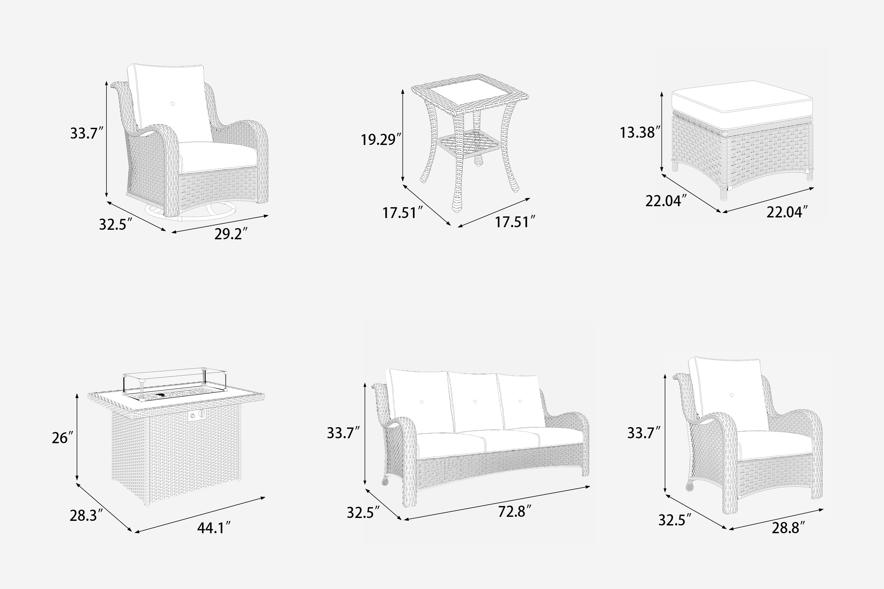 • The set include 2*swivel chairs, 2*single chairs, 2*ottomans, 1*sofa, 2*tables & 1*fire table.