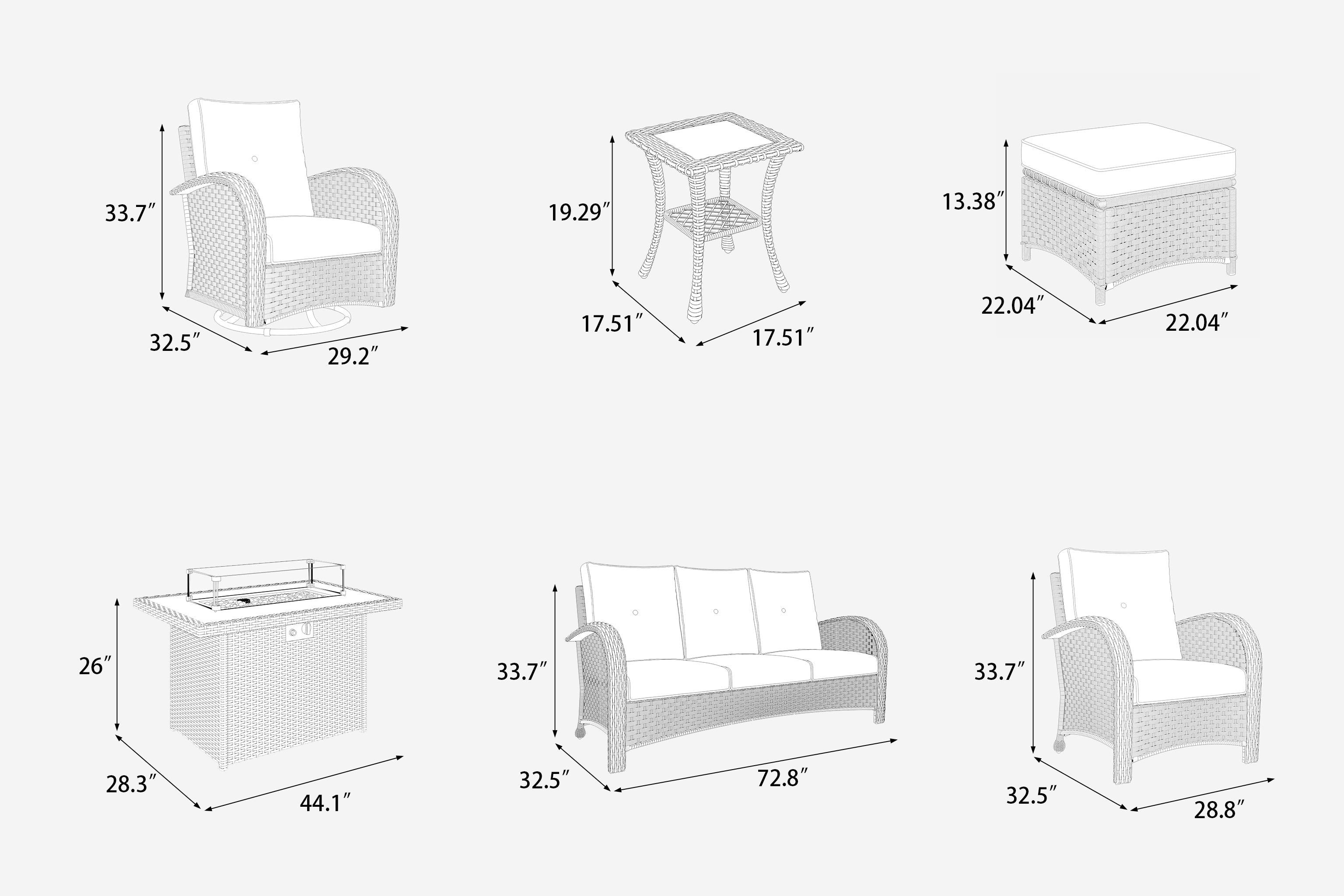 • The set include 2*swivel chairs, 2*single chairs, 2*ottomans, 1*sofa, 2*tables & 1*fire table.