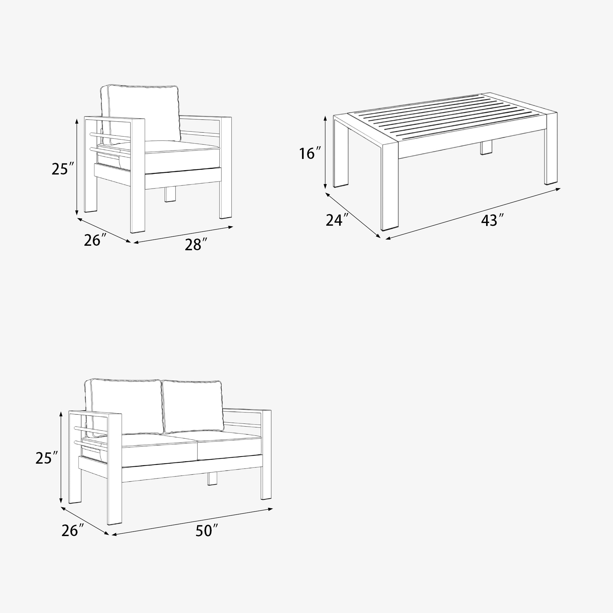 Enjoy the simple elegance of its cushions, gentle angles, and minimalist design that is perfect for patios - large and small. A lightweight and durable aluminum frame is an excellent choice for any relaxed outdoor living space. The cushions with quick-drying, and UV-treated to create a supportive, yet comfortable seat that is meant to last throughout the seasons.