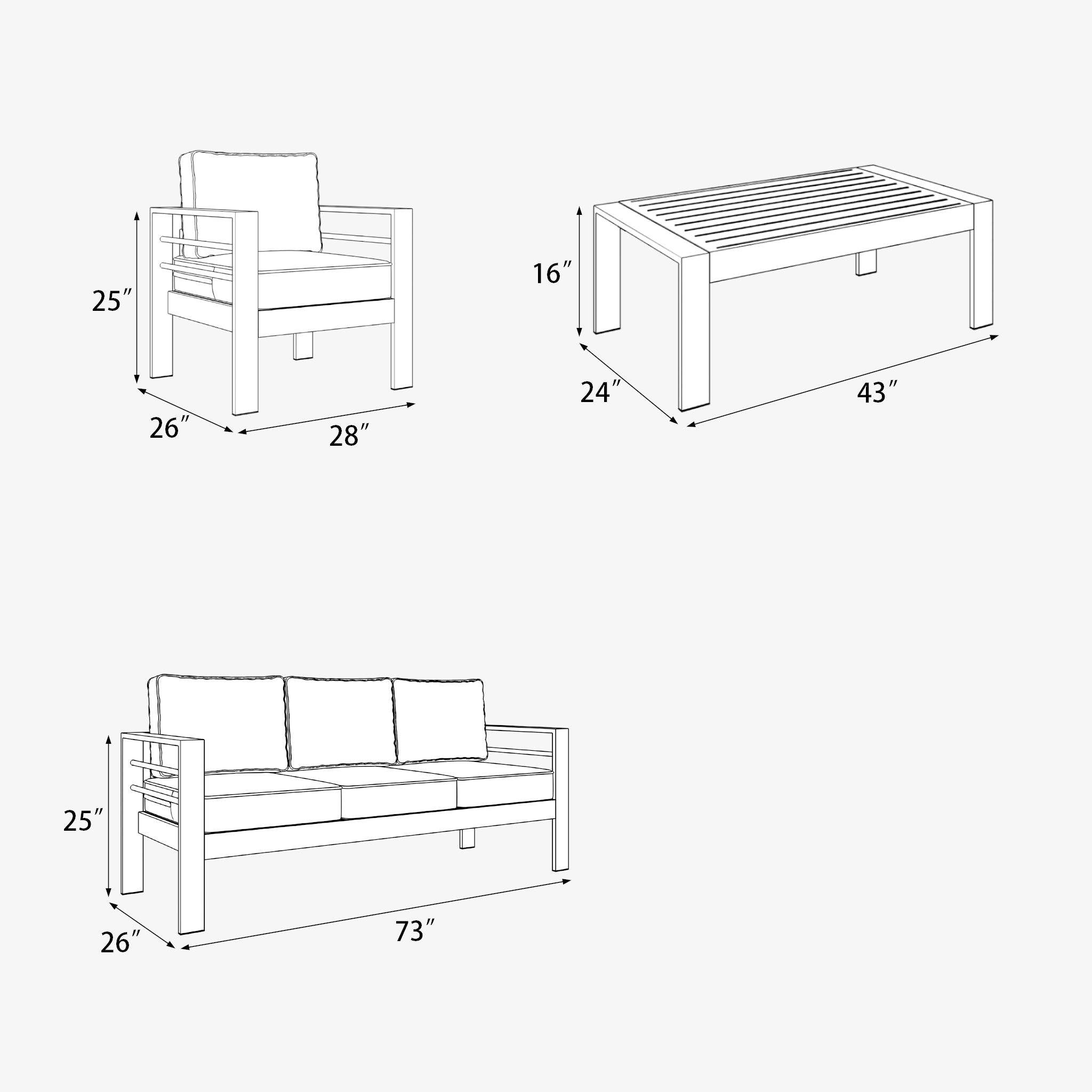 Enjoy the simple elegance of its cushions, gentle angles, and minimalist design that is perfect for patios - large and small. A lightweight and durable aluminum frame is an excellent choice for any relaxed outdoor living space. The cushions with quick-drying, and UV-treated to create a supportive, yet comfortable seat that is meant to last throughout the seasons.