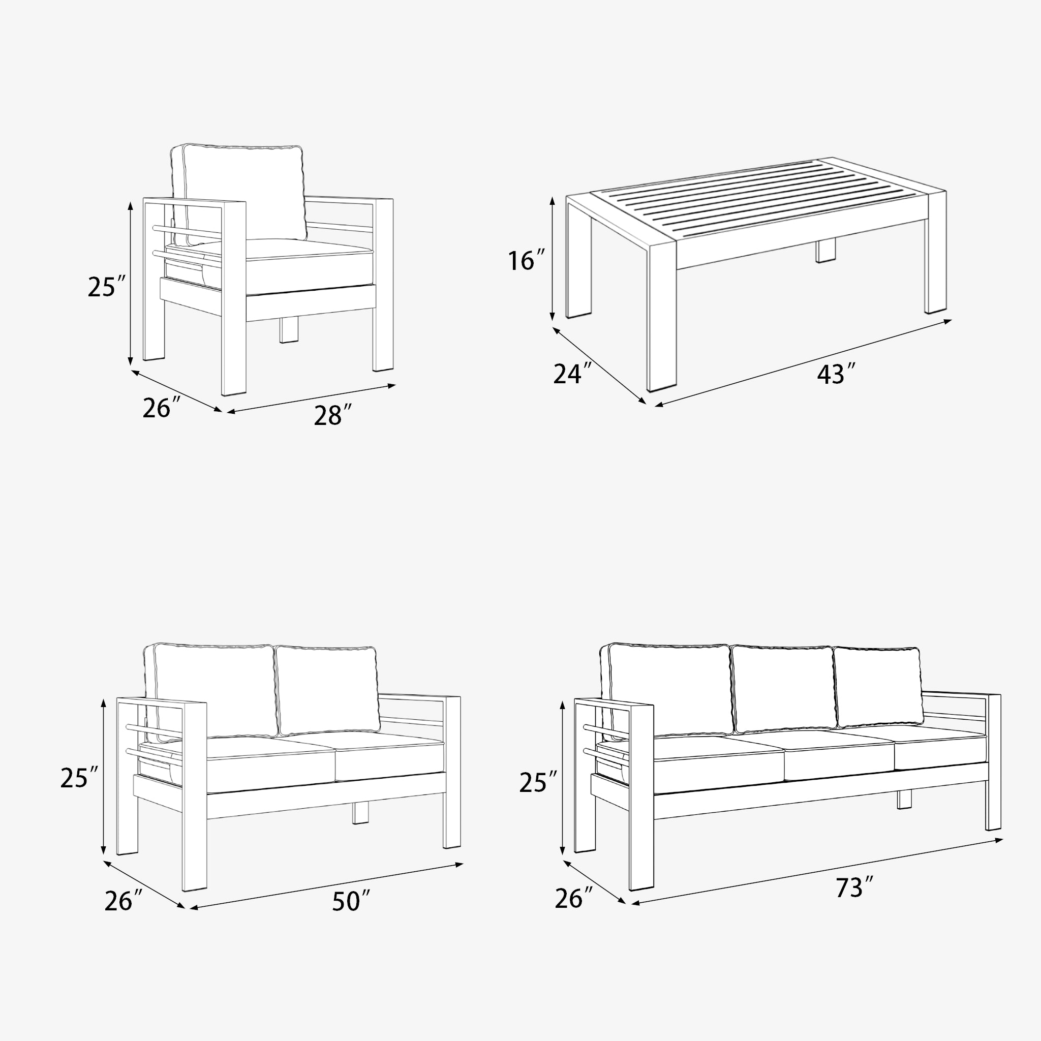 Enjoy the simple elegance of its cushions, gentle angles, and minimalist design that is perfect for patios - large and small. A lightweight and durable aluminum frame is an excellent choice for any relaxed outdoor living space. The cushions with quick-drying, and UV-treated to create a supportive, yet comfortable seat that is meant to last throughout the seasons.