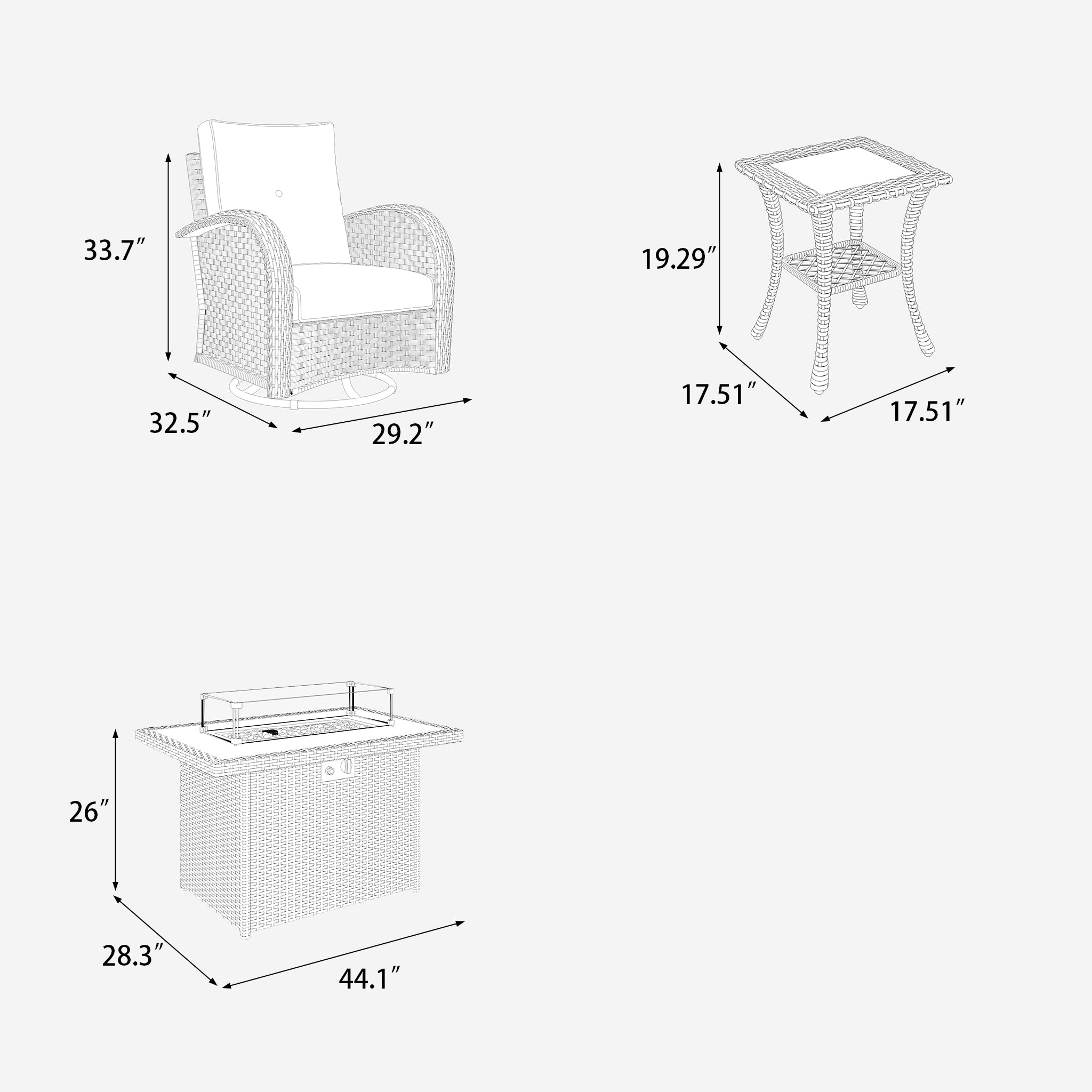 • The set consists of 4*swivel chairs,2*coffee tables and 1*fire pit table.